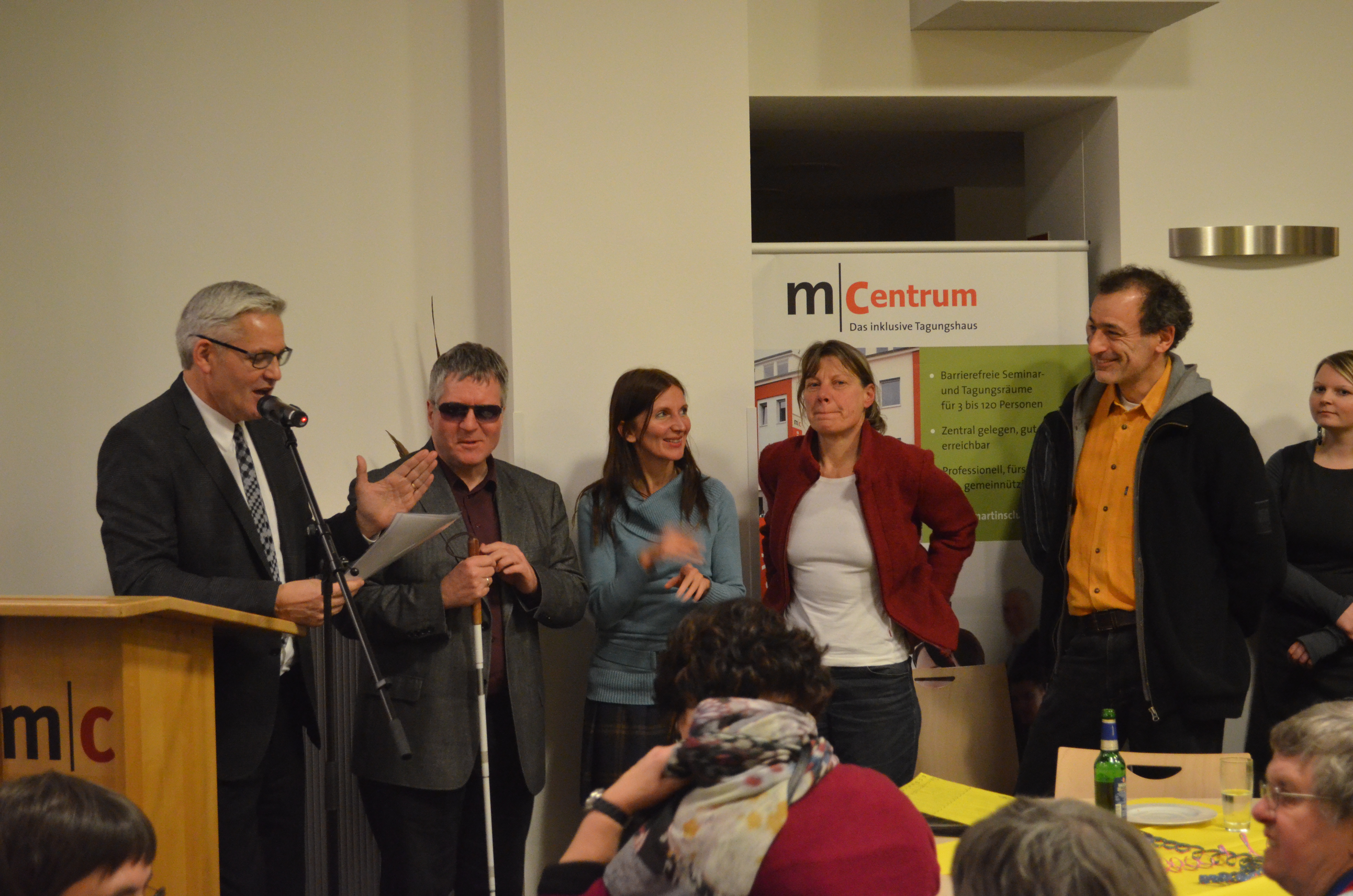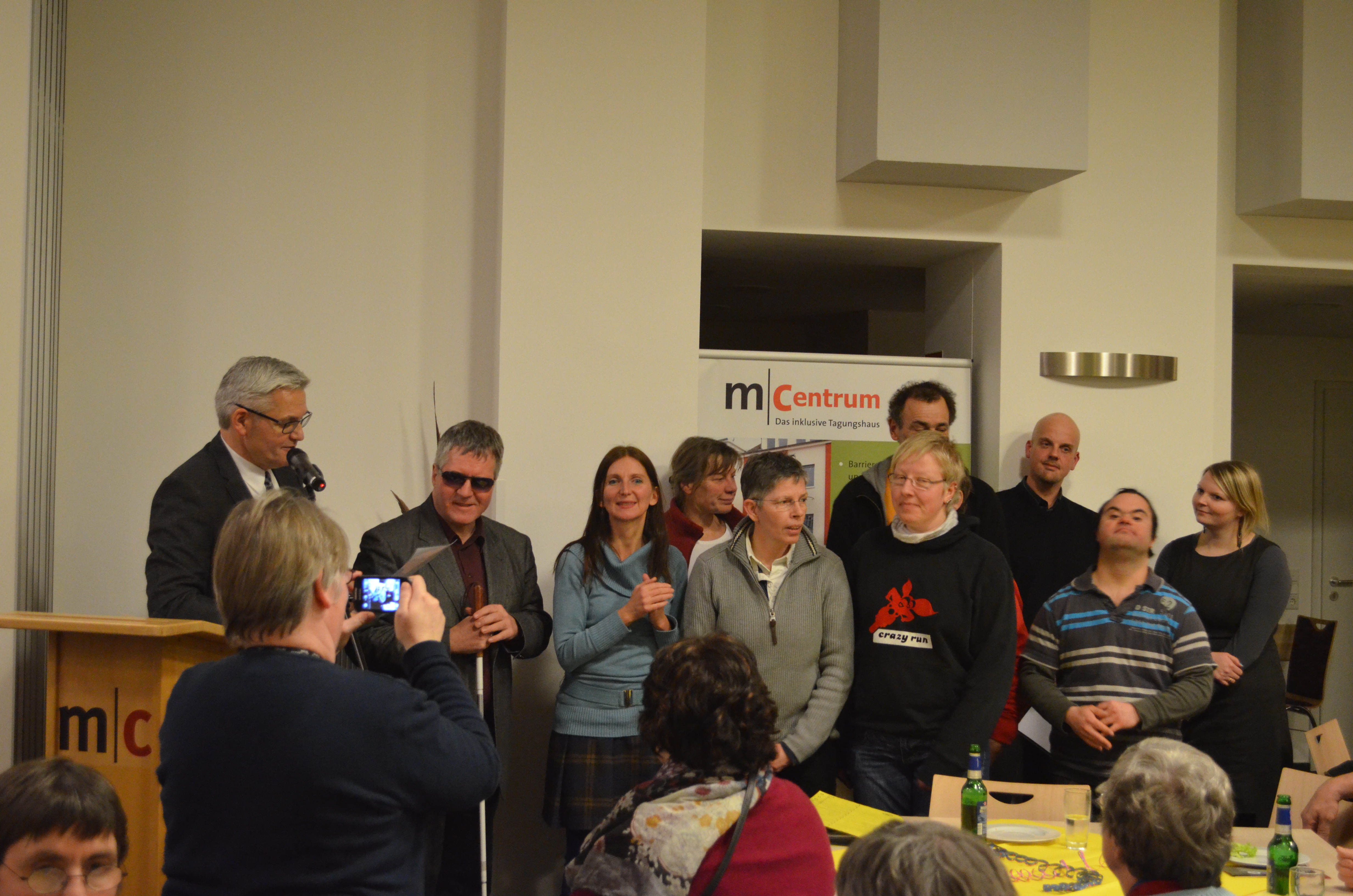 Auf diesem Foto sind Herr Hüppe, Herr Dr. Steinbrück und alle Gewinner-Institutionen zu sehen. Herr Hüppe hält gerade seine Rede. - Datei öffen/herunterladen (JPG, 7.0 MB) -