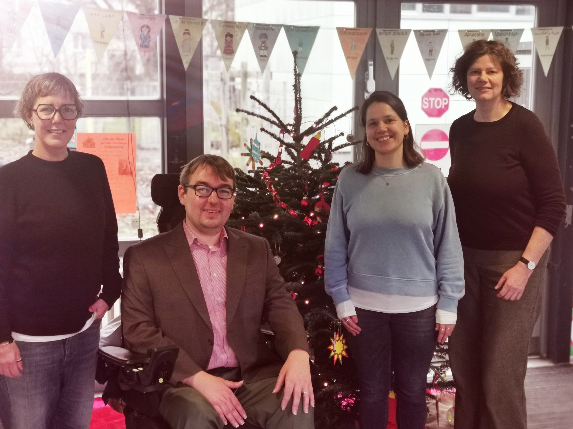 Die Teilnehmenden beim Besuch der Schule neben einem Weihnachtsbaum