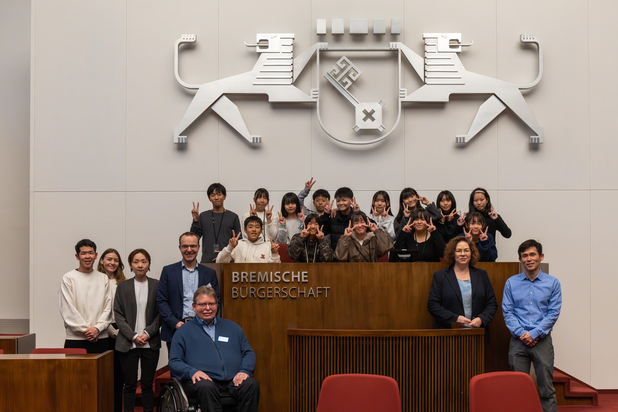 Gruppenbild der Schülergruppe, Andreas Conrads und Kai Steuck im Parlament am Präsidentinnenpult