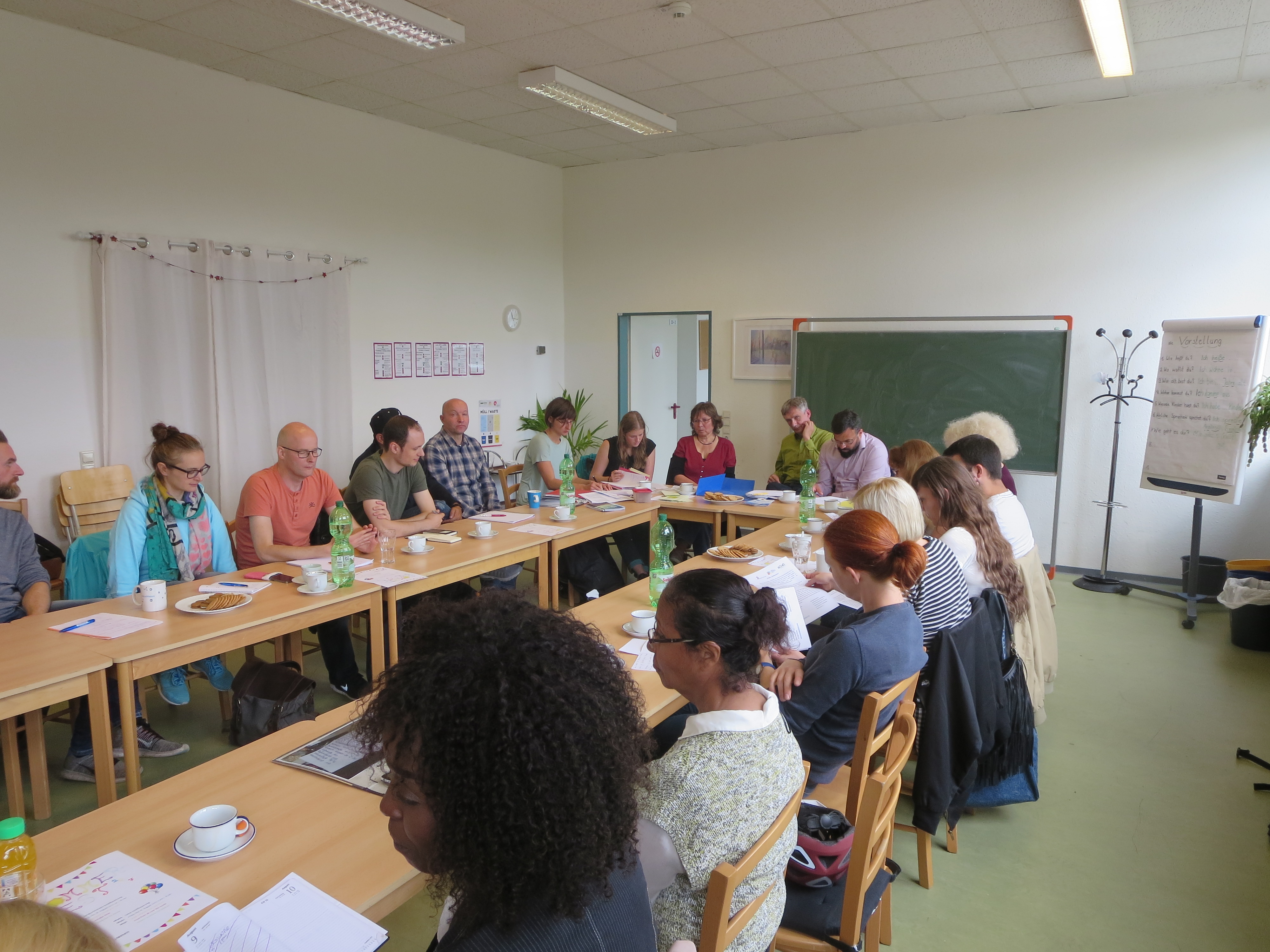 Auf dem Bild sind eine Reihe an Leuten zu sehen, die an Tischen im U-Format sitzen. Alle Stühle sind besetzt. - Datei öffen/herunterladen (JPG, 2.6 MB) -