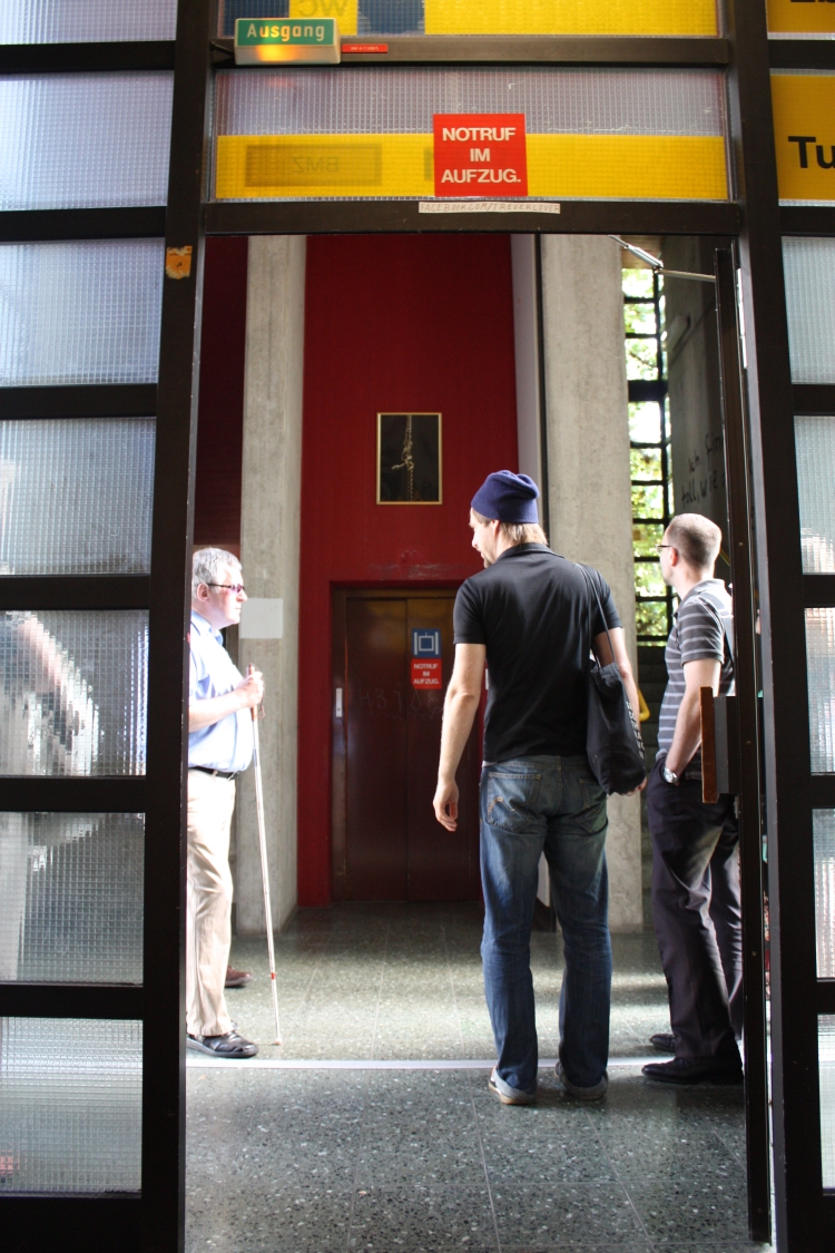 Herr Pfreundt steht in der Mitte der Interessierten und erläutert das Kunstwerk. Es handelt sich um ein Bild, welches über dem Aufzug im Turm D im GW2 hängt. Darauf ist ein Tau zu sehen, bei dem bereits einige Fasern gerissen sind. Insgesamt drei Fotografien kommentieren die Fahrstuhlsituation des GW2 und haben dabei schon einige kontroverse Reaktionen hervorgerufen. - Datei öffen/herunterladen (jpg, 621.9 KB) -