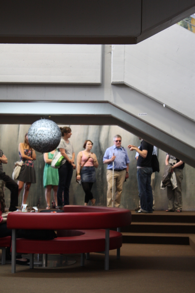 Die Gruppe um den Landesbehindertenbeauftragten steht vor dem Kunstwerk "Ein exklusiver Ort". Es handelt hierbei um einen Sitz- und Arbeitsbereich, welcher nur über Stufen zu erreichen ist und daher vor allem Rollstuhlfahrer ausschließt. Die Exklusivität dieses Ortes unterstreicht nun eine mit über 2800 Fotografien verzierte Discokugel. - Datei öffen/herunterladen (jpg, 477.3 KB) -